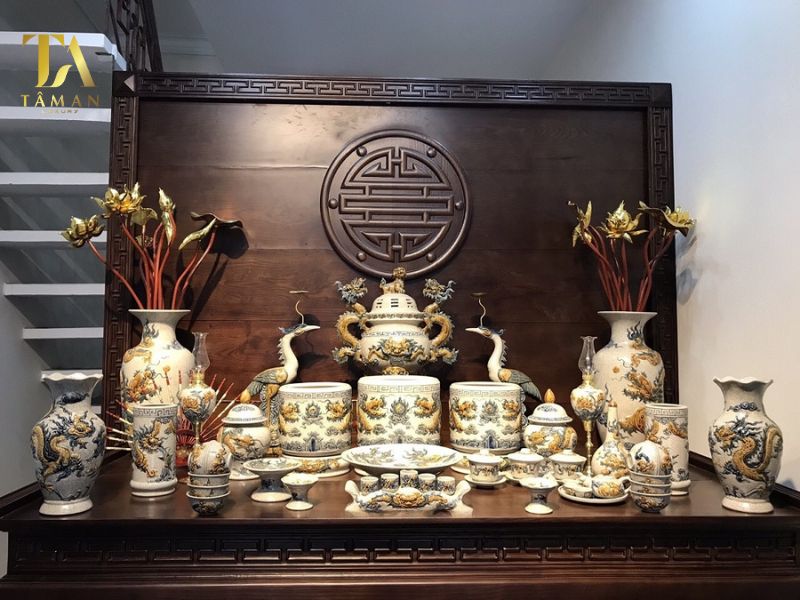 Bộ ấm trà gồm 1 ấm và 3-5 chén. Ấm chén thờ thường được sử dụng để đựng nước hoặc trà để dâng lên gia tiên trong các nghi lễ thờ cúng, tượng trưng cho sự thịnh vượng và bình an.